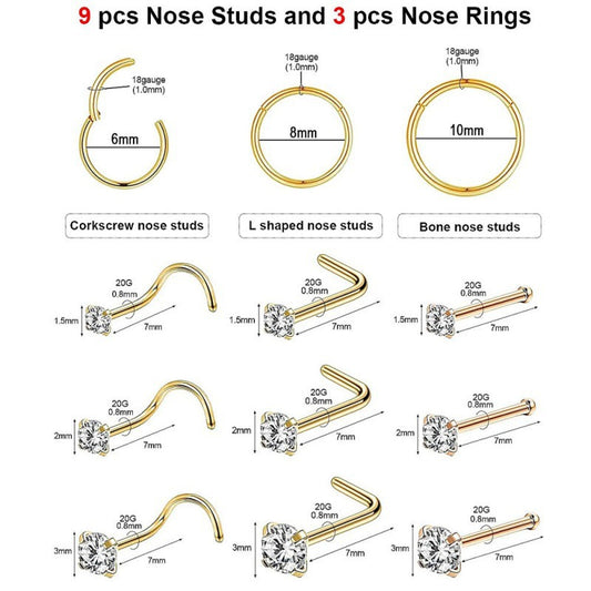 Sale price From $10.49Shipping IncludedStylish 12-Piece Stainless Steel Nose Studs and Rings Set with Zirconia for Everyday Wear