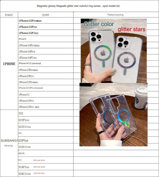 Sale price $9.99Shipping IncludedVibrant Magnetic Clear Case for Samsung Galaxy S22/S23/S24 - Shockproof, Stylish Design with Starry Glitter Finish