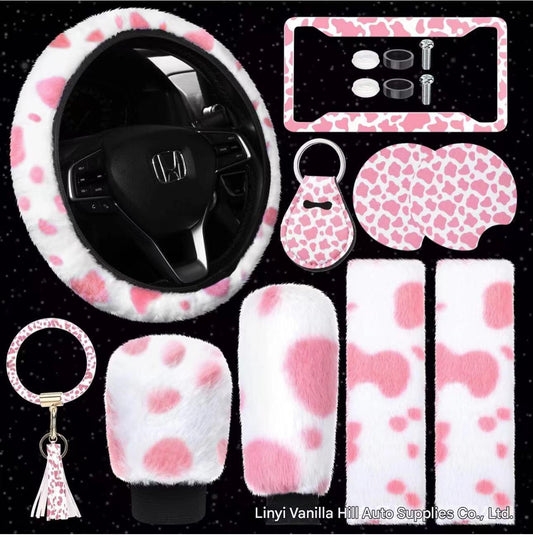 Sale price $35.99Shipping IncludedDeluxe 10-Piece Car Accessories Set – Stylish Steering Wheel Cover, Handbrake & Gear Shift Covers, Shoulder Pads, Cup Mat, Keychain in Cow Print Style