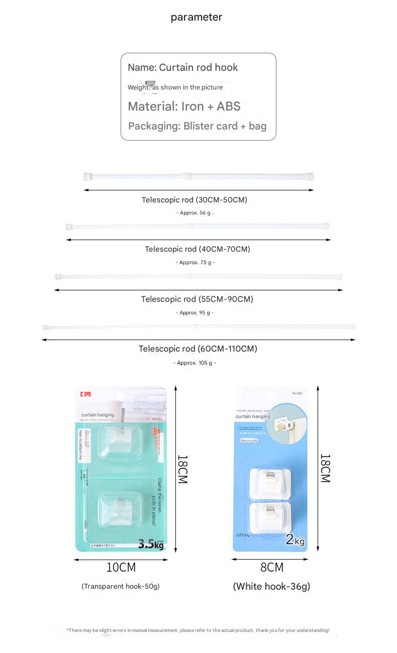 Discover the simplicity and effectiveness of our Adjustable No-Drill Curtain Rod. Designed to be versatile, this tension rod easily adapts to your living space without the need for drilling or permanent installation, making it perfect for renters or frequent movers. Suitable for hanging curtains, storing clothes, or organizing shoes, its durable ABS construction and adjustable length provide reliable support in any area of your home. Available in several sizes and colors, it seamlessly integrates with any decorating style.