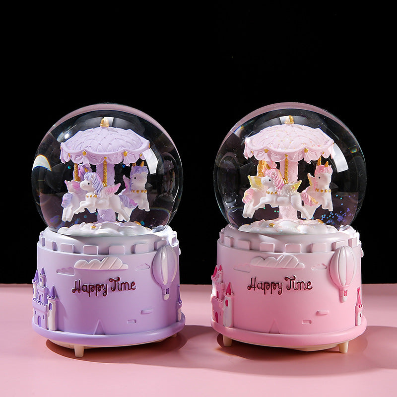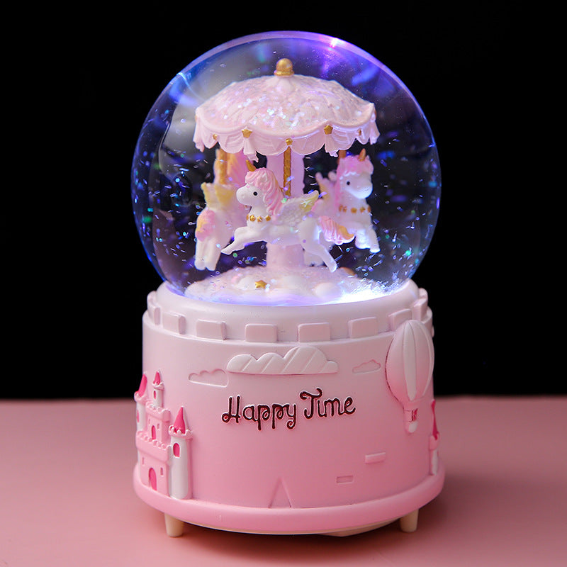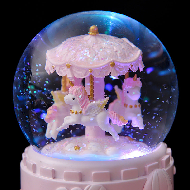 Transform any room into a magical space with our Carousel Crystal Globe Music Box. This beautifully crafted item combines the nostalgic charm of a classic carousel with the enchanting beauty of a crystal globe. It features a meticulously hand-painted resin structure that ensures longevity while showcasing intricate artistry. Choose between various sizes and colors to find the perfect match for your decor or gifting needs. Whether celebrating a birthday, holiday or special occasion, this music box is the go-to choice. Its automatic snow drift feature complements the ambient lighting and soothing tunes, creating a mesmerizing visual and auditory experience that captivates anyone.