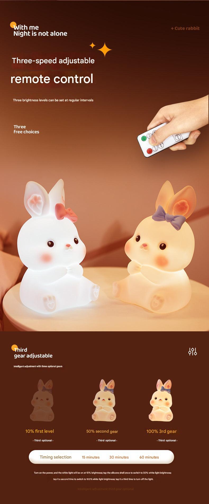 Illuminate your child's bedroom with this enchanting Cute Bunny LED Night Light designed specifically for kids. Perfect for nighttime feedings or comforting a child afraid of the dark, this night light features easy tap control to switch between colors and modes effortlessly. The safe, soft-touch silicone material is free from harmful substances, making it completely safe for the nursery. With its USB rechargeable function, it's not only eco-friendly but also perfect for travel. Bring home this delightful helper to ensure sweet dreams every night.