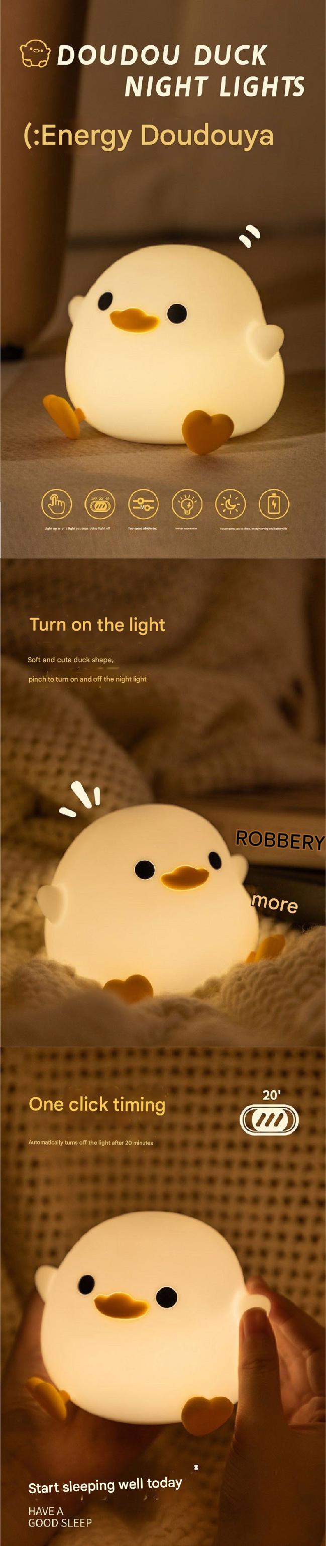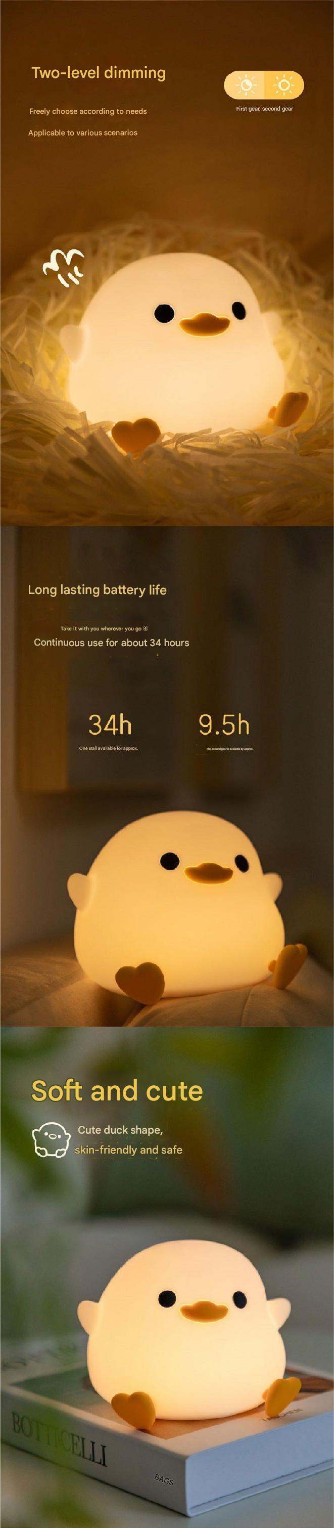 Illuminate your child's bedroom, nursery, or dorm room with our Cute Cartoon Duck Silicone Night Light. Designed to delight and comfort, this adorable lamp features a touch-activated light that adjusts easily for the perfect nighttime glow. Crafted from safe and squishy silicone, it's both playful and practical. Whether you're looking for a reassuring sleep companion for your child or a charming decorative light, this versatile lighting solution caters to both needs with its easy-to-use design and USB rechargeable battery. It's perfect for creating a cozy atmosphere or accompanying late-night reading sessions.