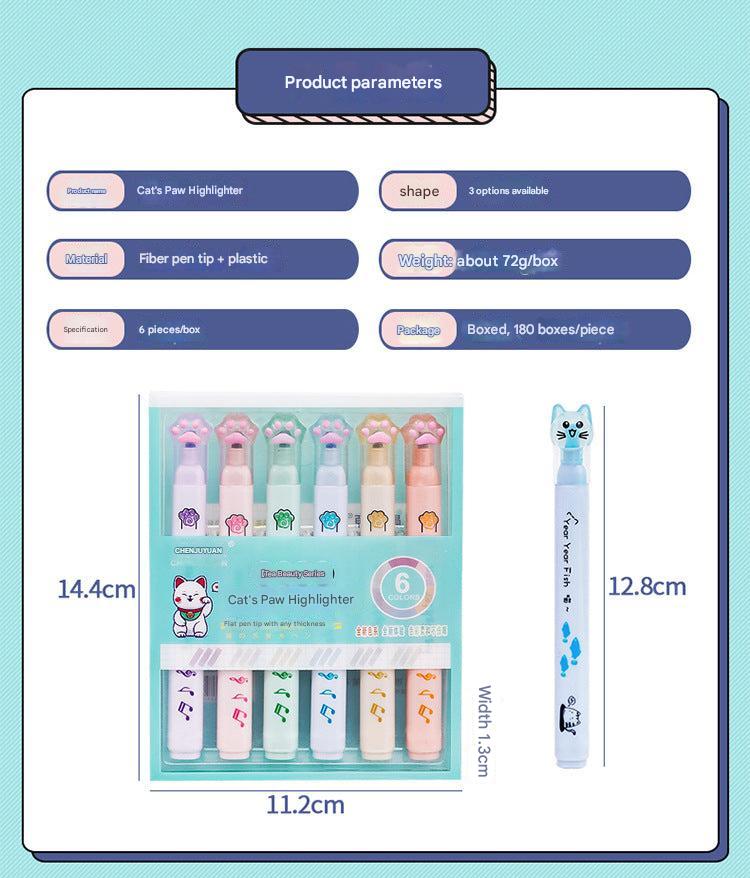 Elevate your studying and journaling experience with our Cute Cat Paw Fluorescent Highlighters Set! Designed with a unique cat paw theme, these highlighters are not only adorable but effective. The set features a range of soothing pastel colors, making it easy to highlight important notes without causing eye strain. The non-toxic ink ensures that they are safe for users of all ages, including young school-aged children. Whether you're preparing for exams, decorating your planner, or adding a splash of color to your sketches, this highlighter set is your go-to tool. Packaged in a handy box, it's easy to keep your desk neat and take your highlighters on-the-go. Perfect as a gift for students, artists, and professionals!