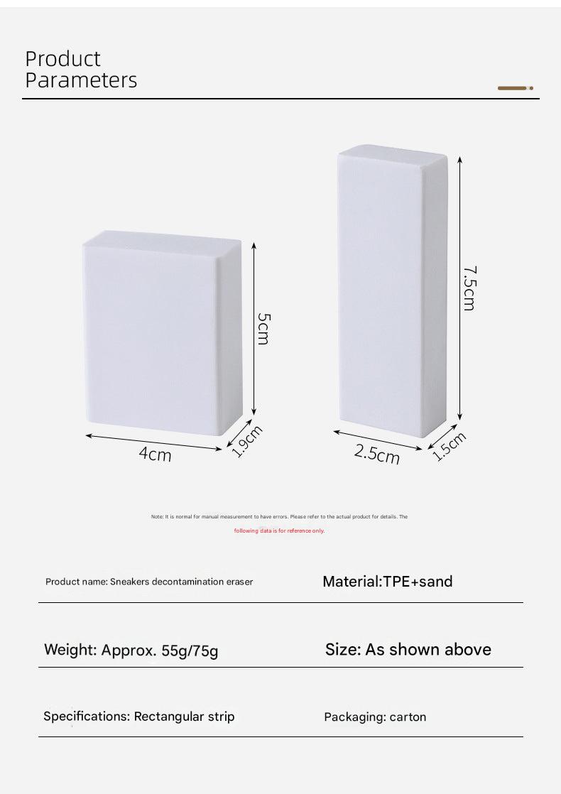 The Effective Suede Rubber Shoe Cleaner Eraser is specifically engineered to remove scuff marks, dirt, and stains from a variety of shoe materials. This product is ideal for sneakers and white shoes, enabling users to maintain their footwear in pristine condition without harsh chemicals. Whether you're getting ready for a night out or just want to maintain the look of your favorite shoes, this compact and lightweight eraser is the ideal solution. It works on TPE and sand materials, ensuring that it's equipped to handle different cleaning scenarios. Use it anytime you notice dirt accumulation to keep your shoes looking great.