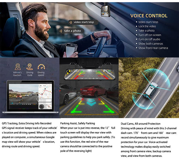 Experience the next level of driving safety with our High Definition 12-Inch 4K Streaming Car Rearview Mirror Dash Cam. Designed for the modern driver, this advanced device combines stunning 4K front recording with 1080P rear footage, ensuring you capture every detail. Featuring top-of-the-line night vision technology, you can drive confidently in low light conditions. The large 170-degree wide-angle lens significantly reduces blind spots, giving you a clearer view of the road. With built-in WiFi and GPS tracking, connecting and sharing your recordings is simple; stay informed of your route with precise location tracking. Designed for easy installation, this rearview mirror seamlessly transforms your vehicle's existing mirror for an elegant solution that enhances safety and convenience on the road.