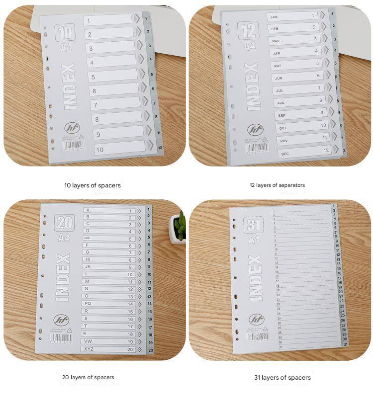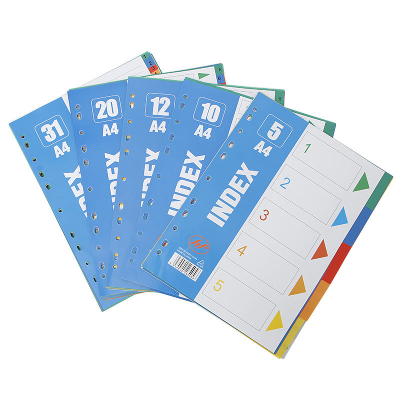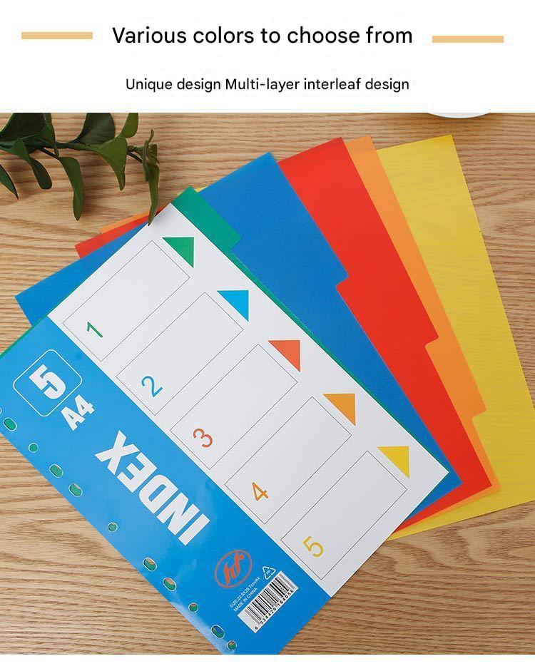 Enhance the functionality and appearance of your information binder with our Premium A4 Colorful Divider Tabs. Each set contains 15 robust polypropylene pages, designed to withstand daily use without tearing or deteriorating. The 11-hole punches provide universal fit, making them suitable for most A4 binders, ensuring your papers stay organized and accessible. Available in a variety of colors and designs, these dividers not only help organize documents but also add a touch of brightness to your workspace. Ideal for corporate environments, exhibitions, and promotions, these tabs can also be customized with your company's logo. Whether you're organizing presentations, reports, or resource materials, our divider tabs make finding your documents faster and easier than ever before.