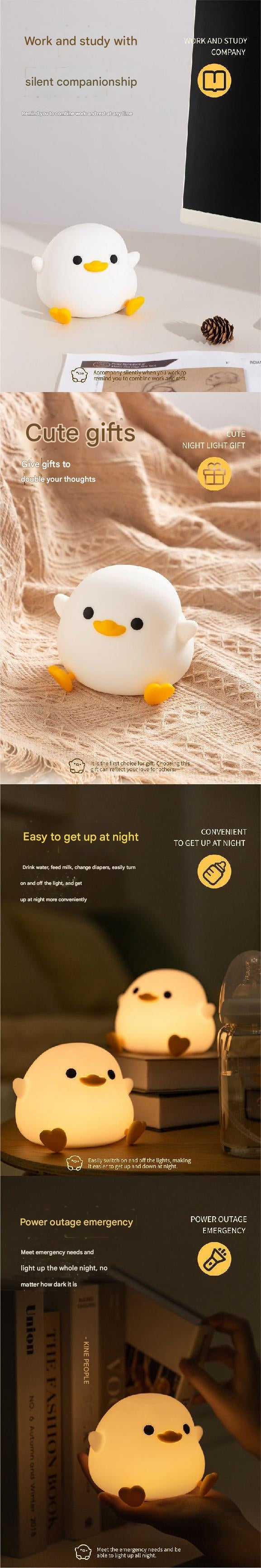 Introducing the adorable, children-friendly Soft Silicone Duck Night Light, perfect for any child's bedroom. This charming bedside lamp is designed with soft, safe silicone and a cute duck shape, making it a lovable part of your child's nighttime routine. The light offers a warm, soothing glow, ideal for bedtime stories or calming down before sleep.