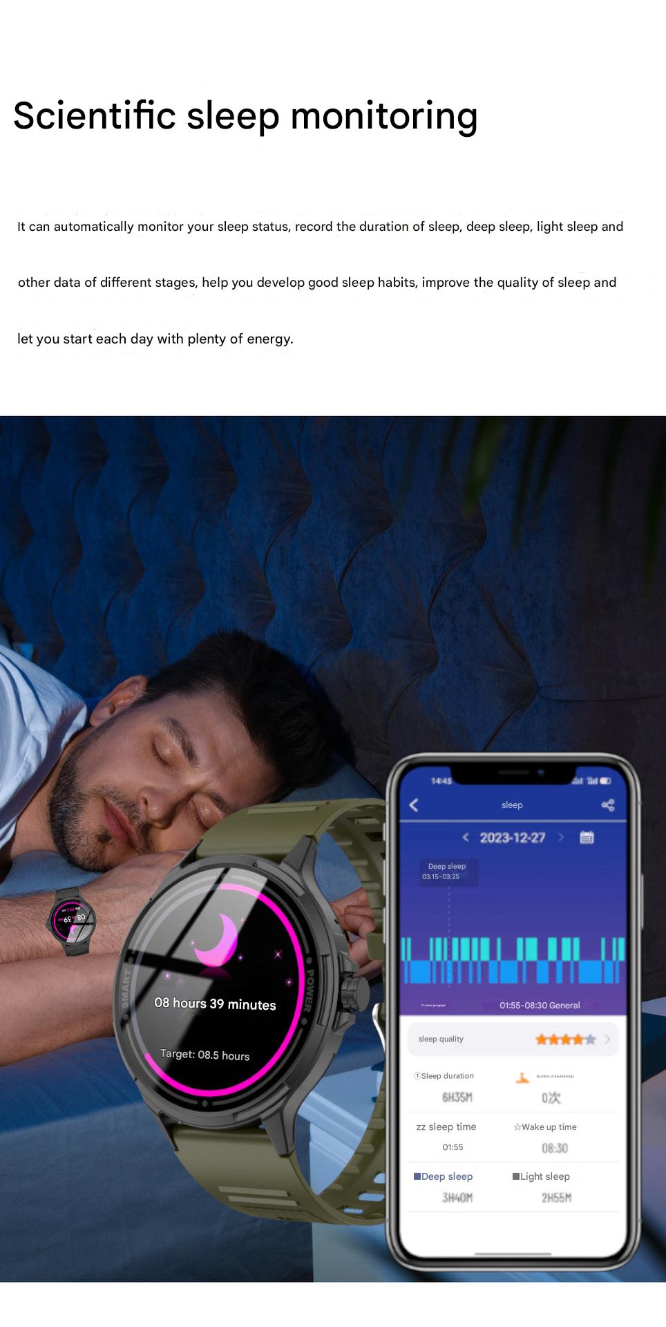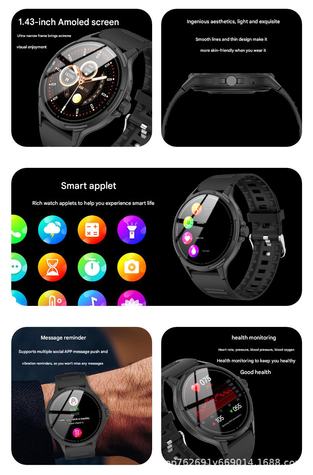 • Health Monitoring: Track your heart rate, blood pressure, blood oxygen, and blood sugar levels for comprehensive health insights.